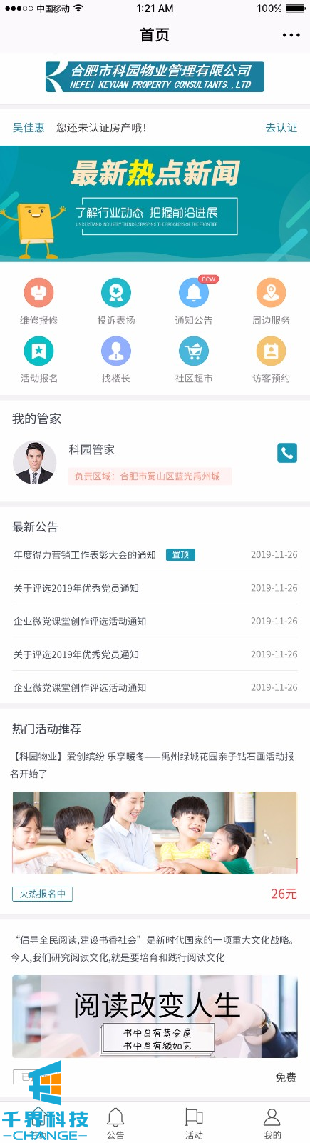 物業(yè)公眾號 投訴建議 活動(dòng)報名 最新公告 表?yè)P表彰 樓棟管理 信息發(fā)布
