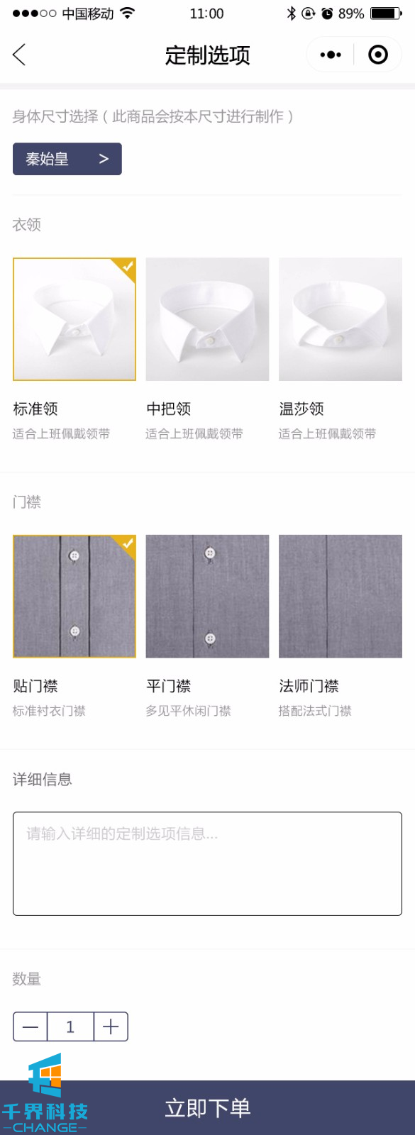 該項目是服裝定制小程序,包含在線(xiàn)下單、定制選項、尺寸上傳、訂單等
