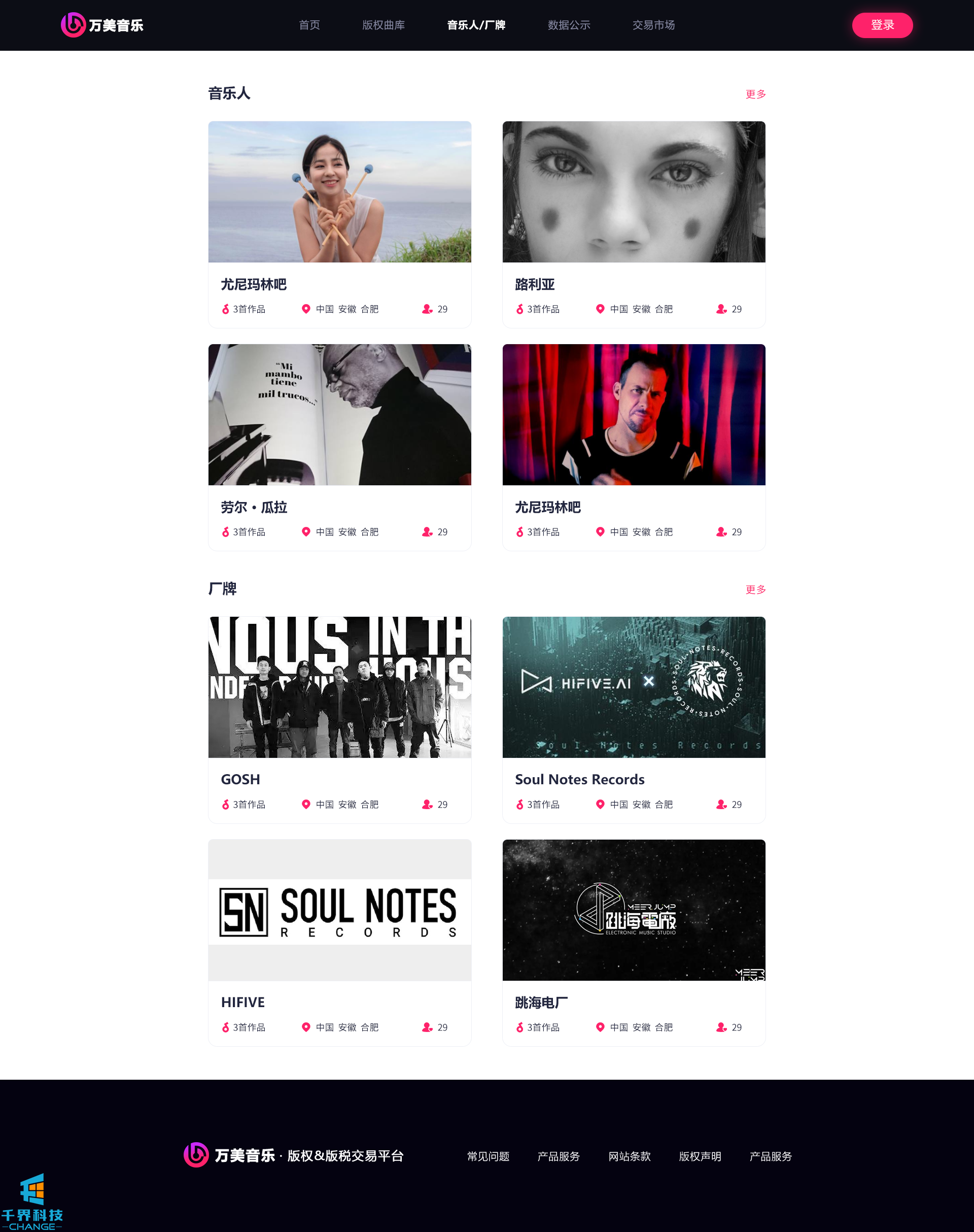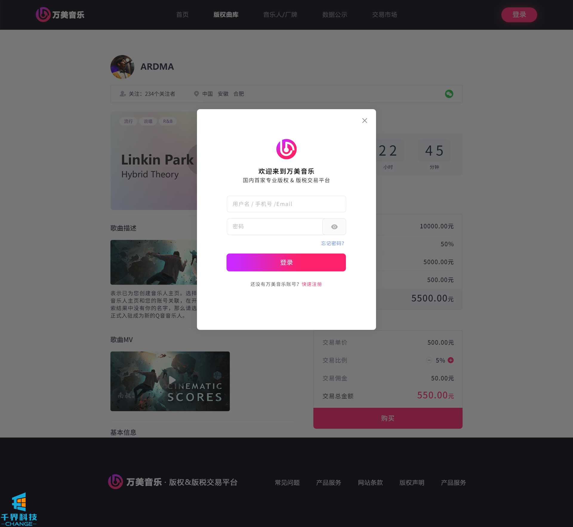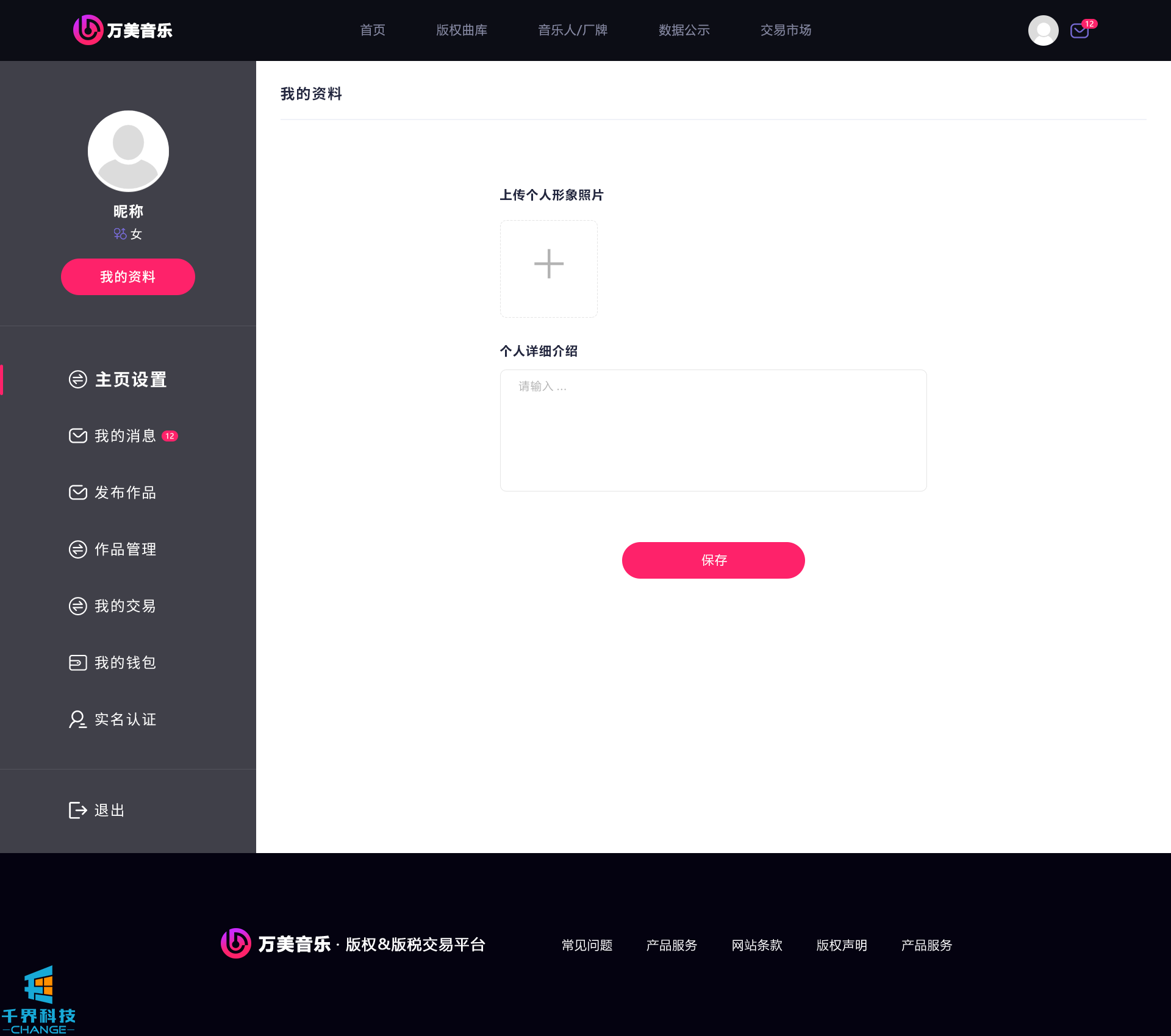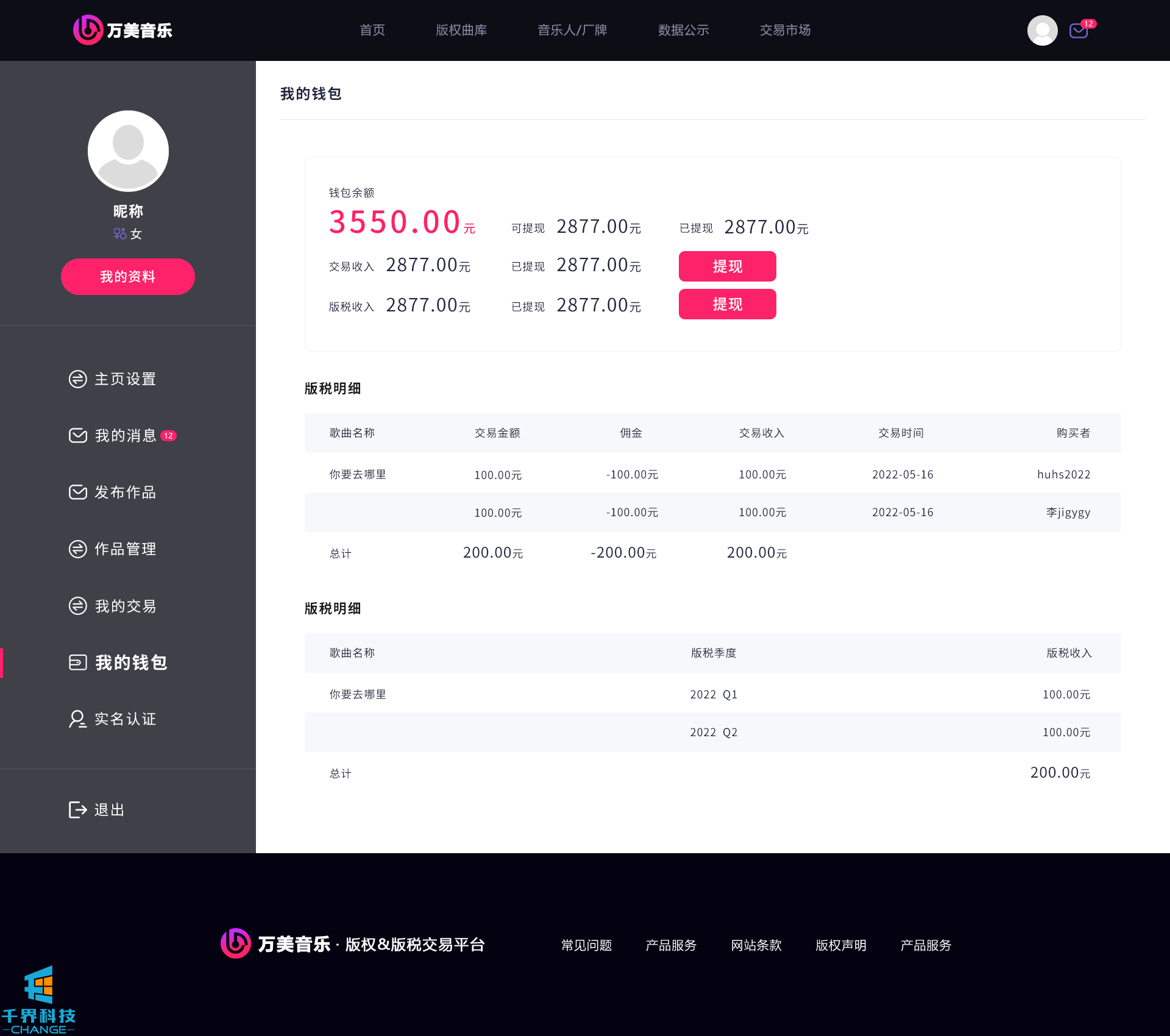 該項目是一個(gè)音樂(lè )網(wǎng)站版權交易網(wǎng)站,音樂(lè )人或者公司可以在網(wǎng)站上出售自己的創(chuàng )作的音樂(lè ),普通用戶(hù)可以通過(guò)購買(mǎi)對應版權,平臺后期會(huì )根據對應的版稅收入給到購買(mǎi)版權的普通用戶(hù)獎勵。