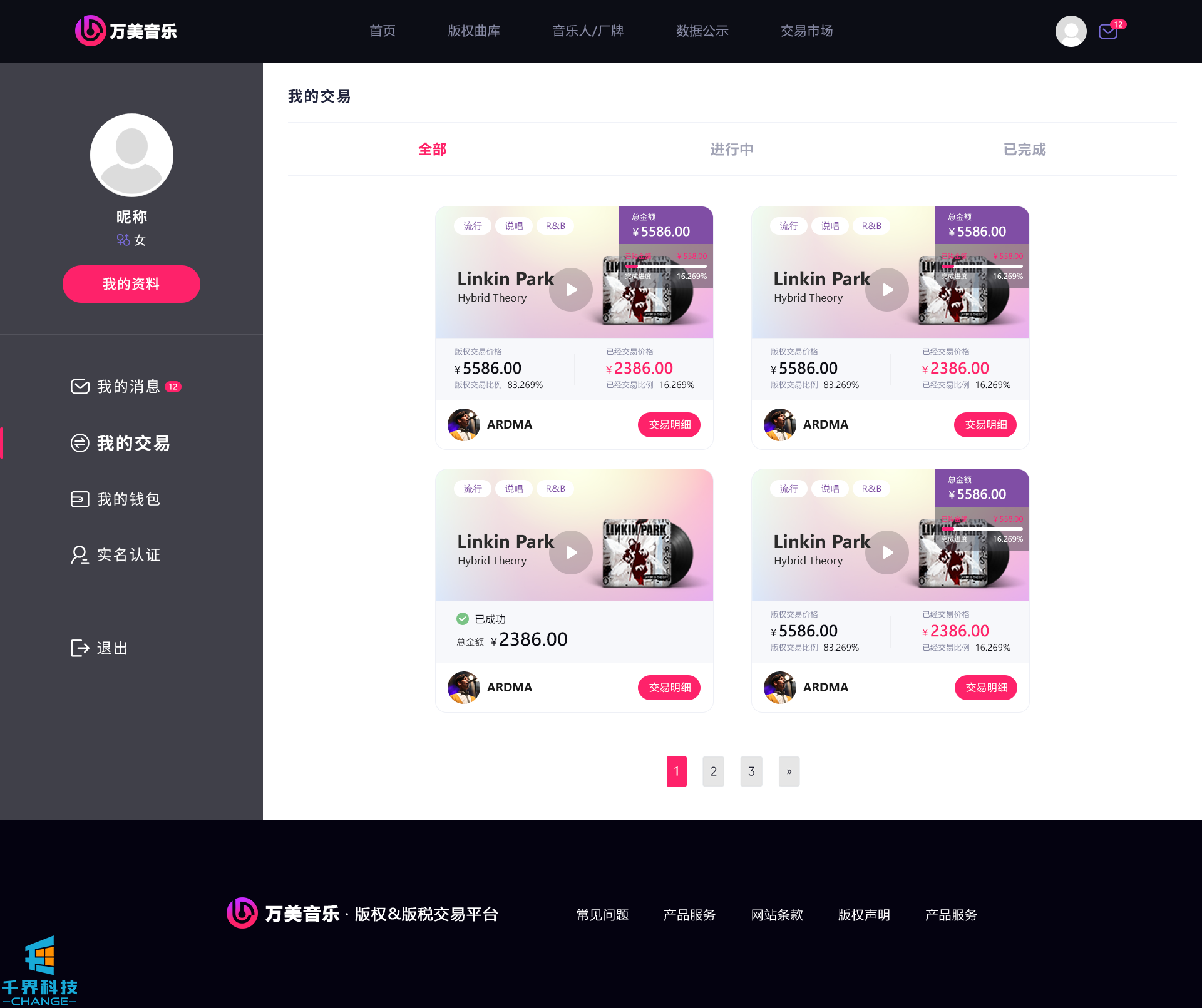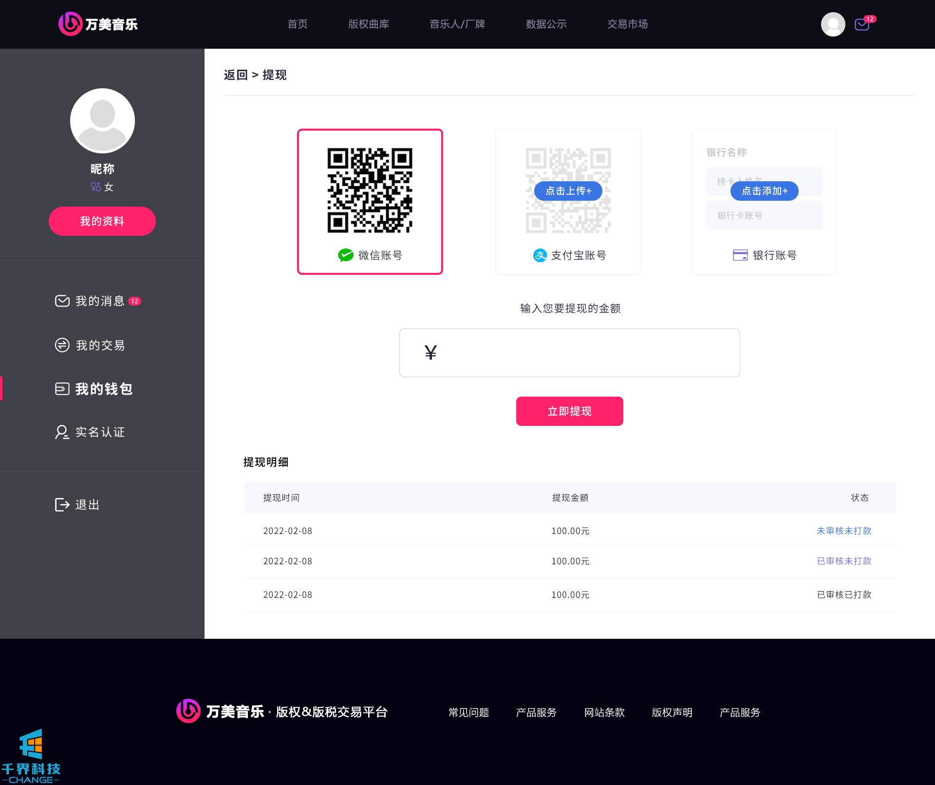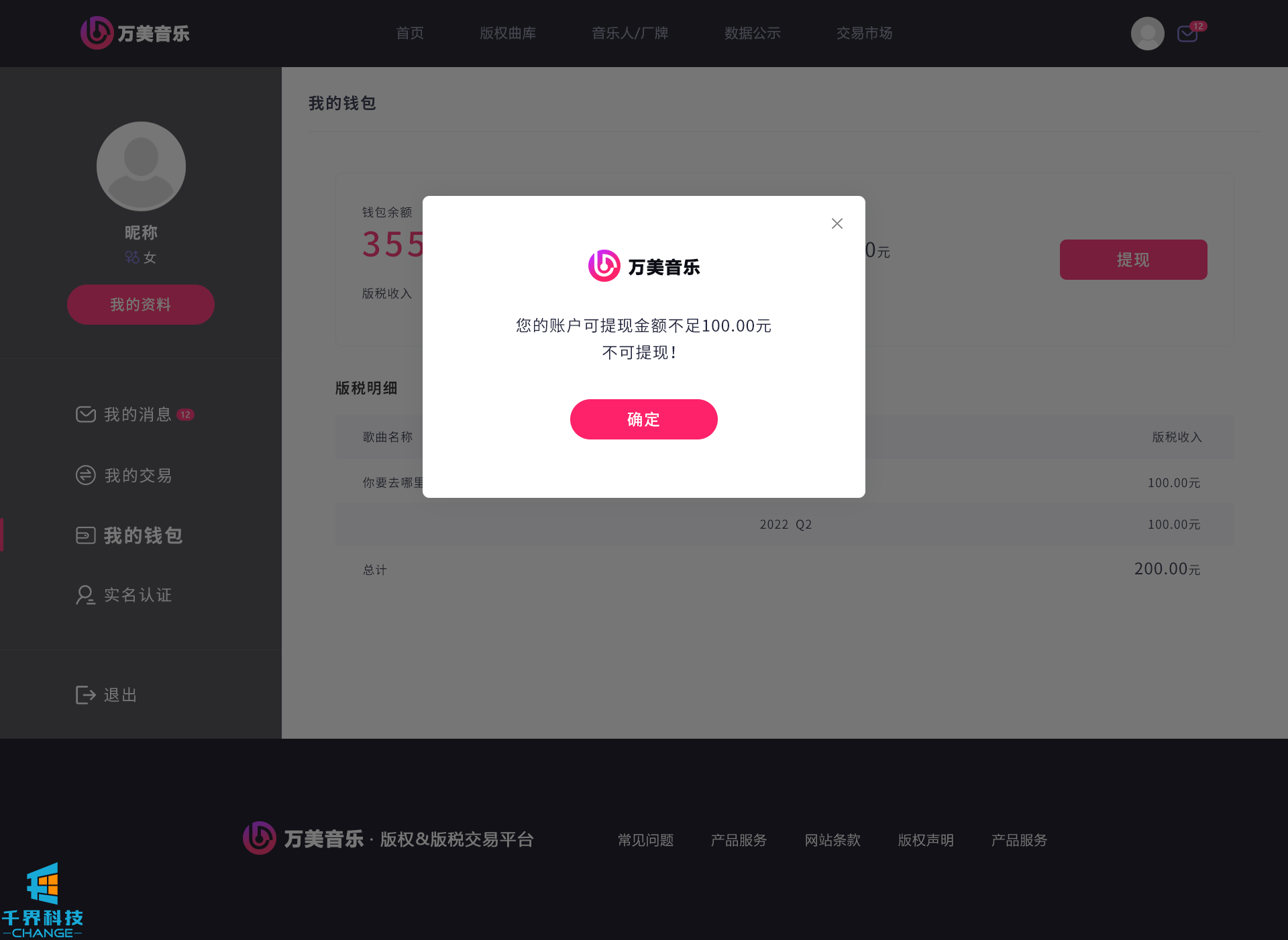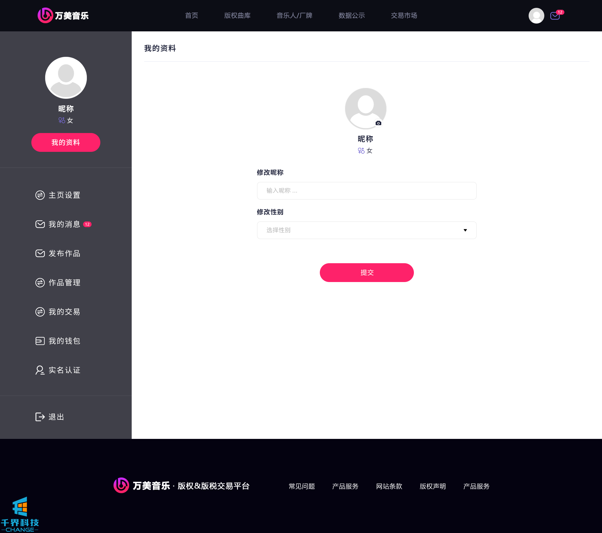該項目是一個(gè)音樂(lè )網(wǎng)站版權交易網(wǎng)站,音樂(lè )人或者公司可以在網(wǎng)站上出售自己的創(chuàng )作的音樂(lè ),普通用戶(hù)可以通過(guò)購買(mǎi)對應版權,平臺后期會(huì )根據對應的版稅收入給到購買(mǎi)版權的普通用戶(hù)獎勵。