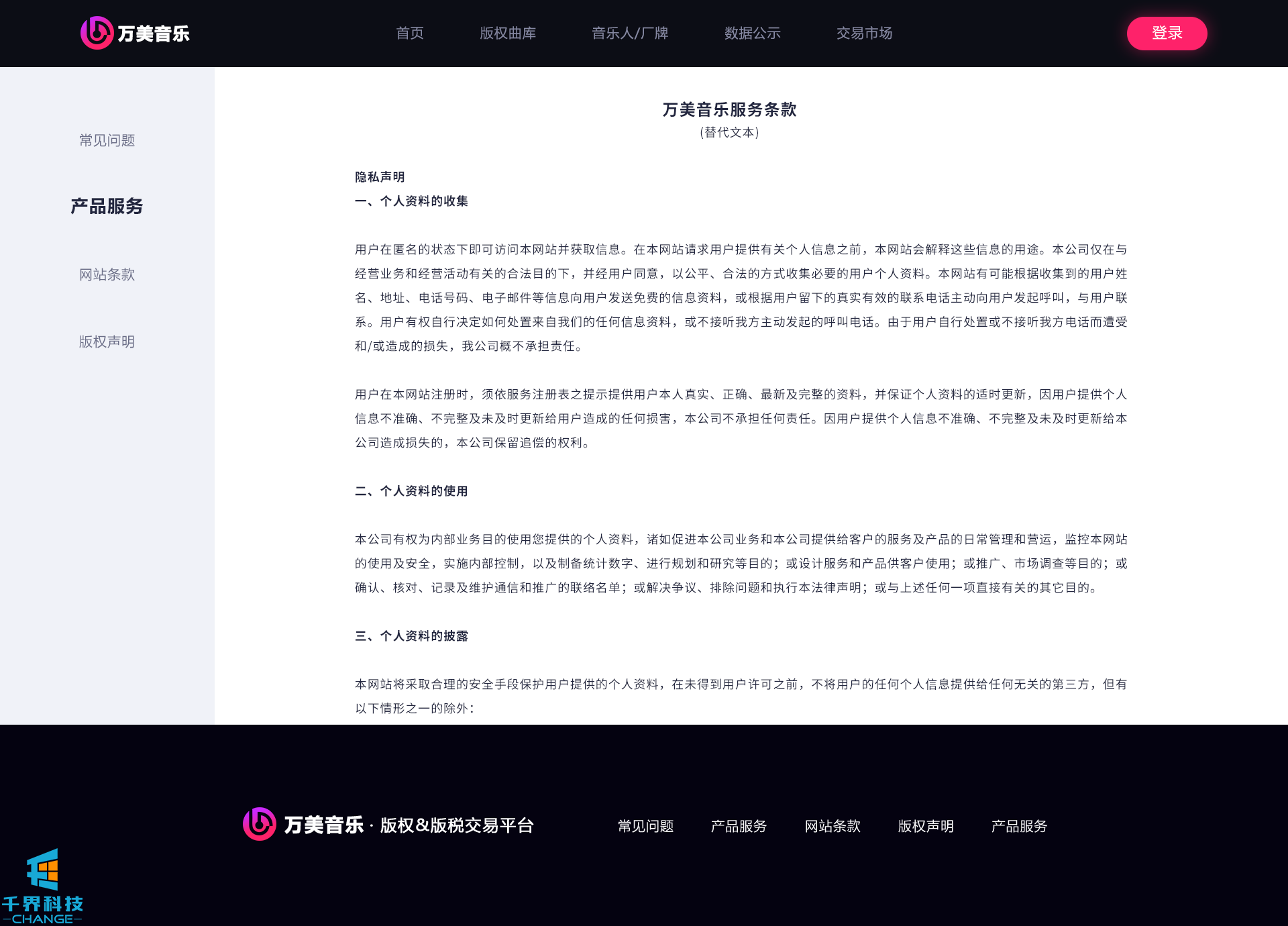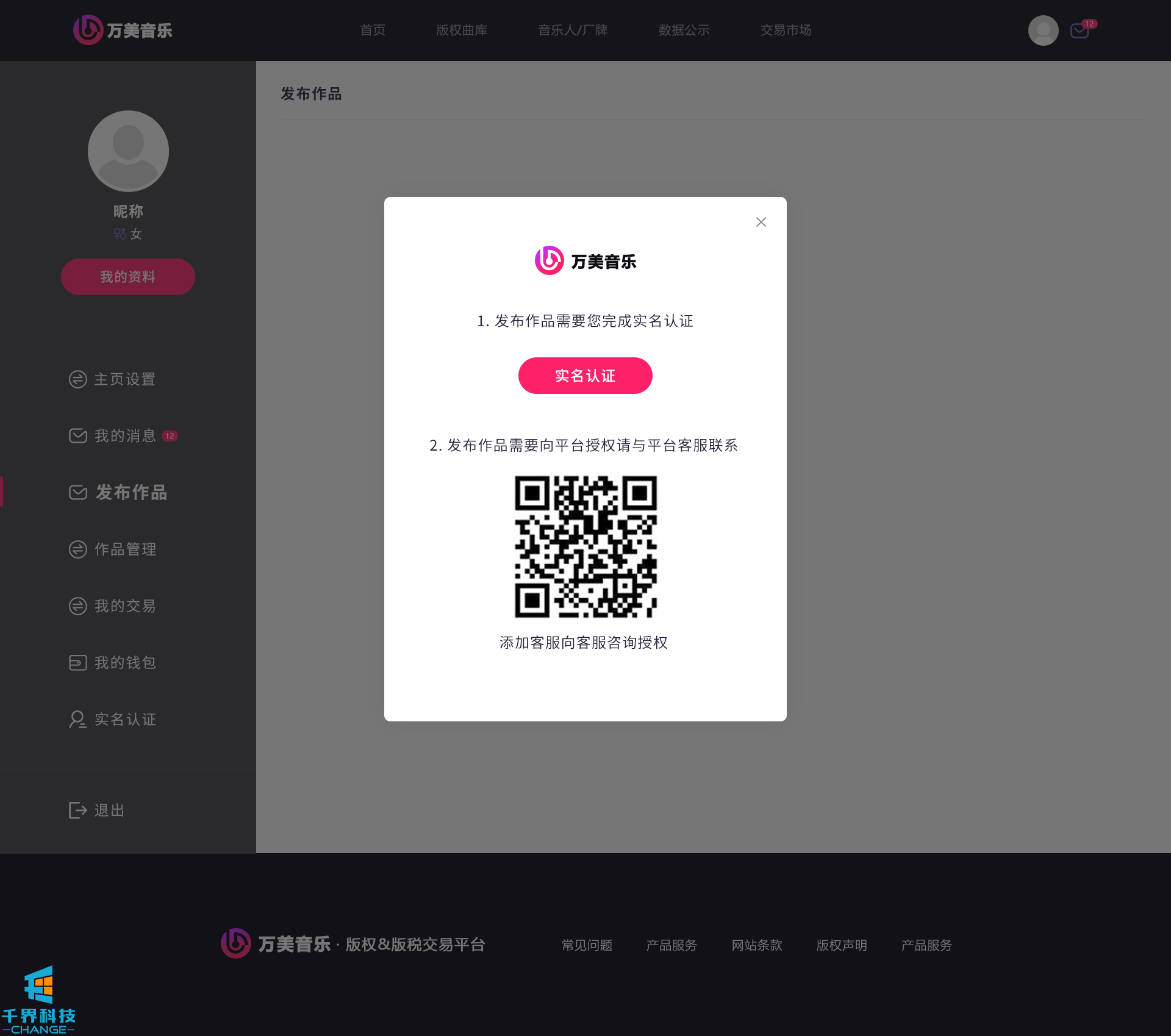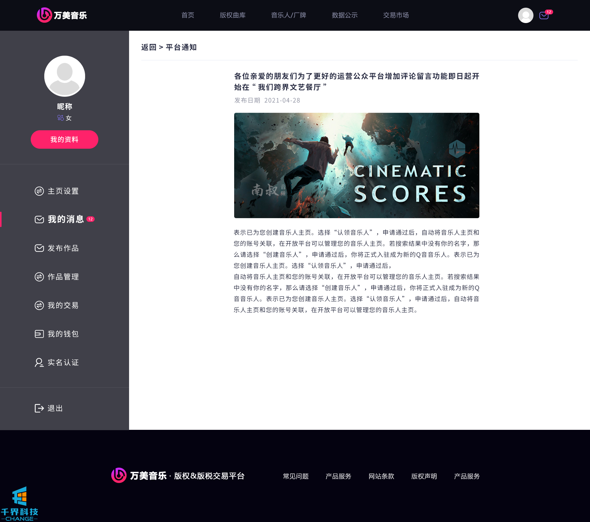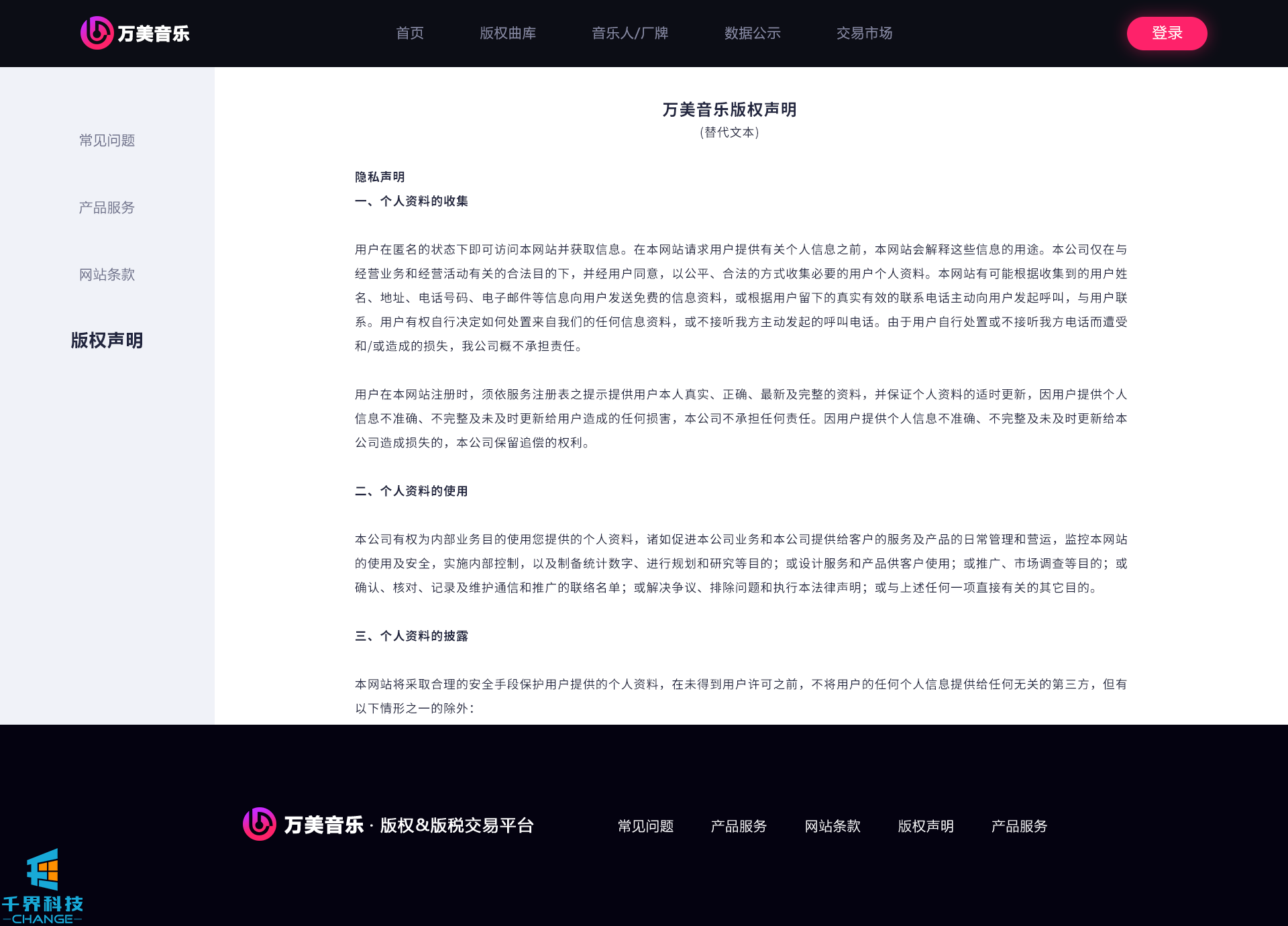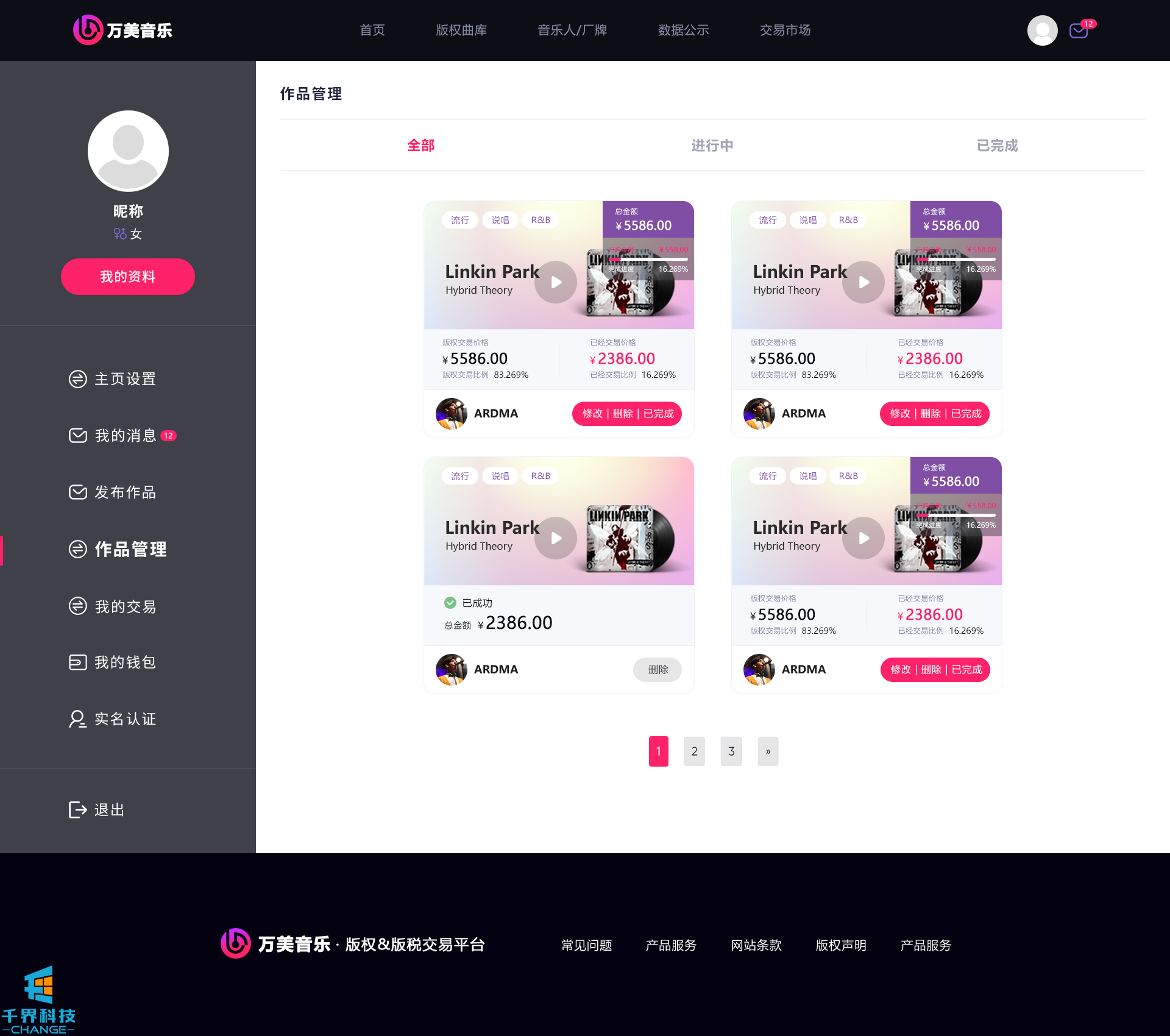 該項目是一個(gè)音樂(lè )網(wǎng)站版權交易網(wǎng)站,音樂(lè )人或者公司可以在網(wǎng)站上出售自己的創(chuàng )作的音樂(lè ),普通用戶(hù)可以通過(guò)購買(mǎi)對應版權,平臺后期會(huì )根據對應的版稅收入給到購買(mǎi)版權的普通用戶(hù)獎勵。