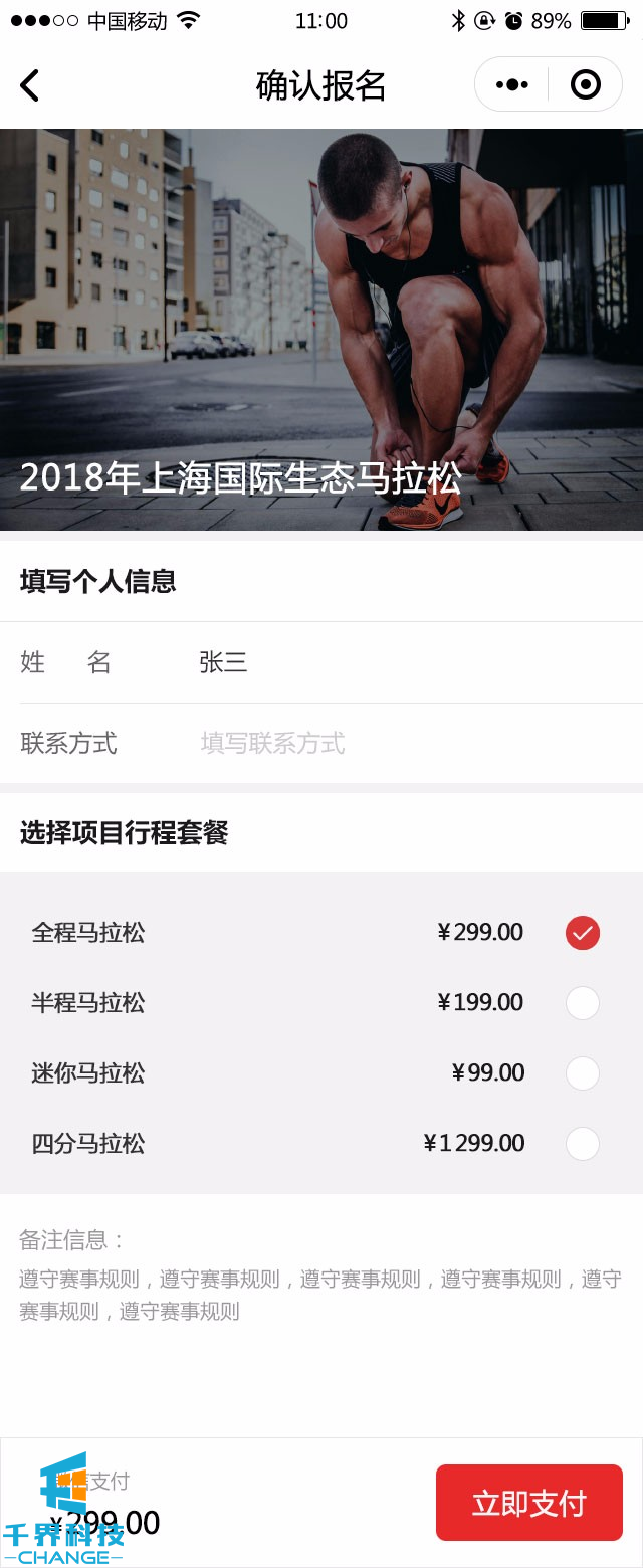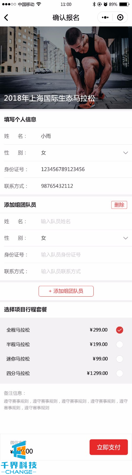 該項目是馬拉松比賽的報名小程序,包含在線(xiàn)報名、在線(xiàn)支付、團隊報名等