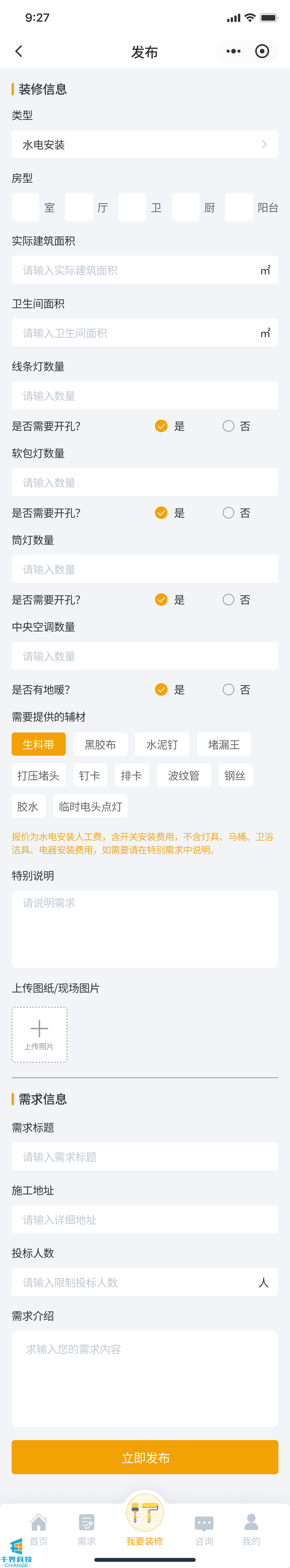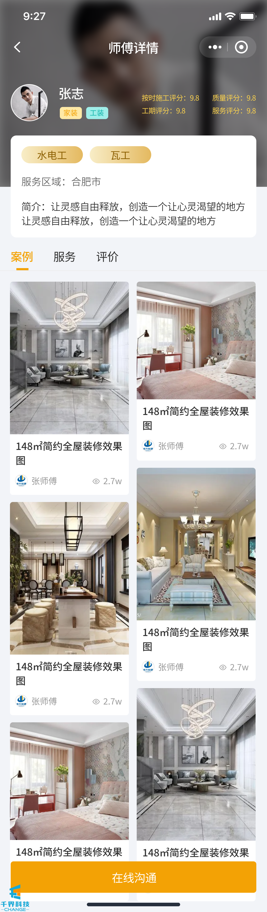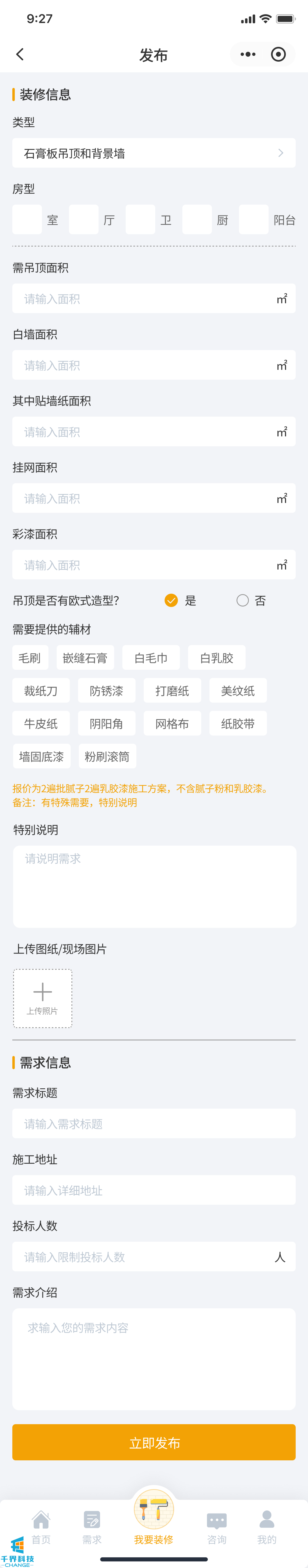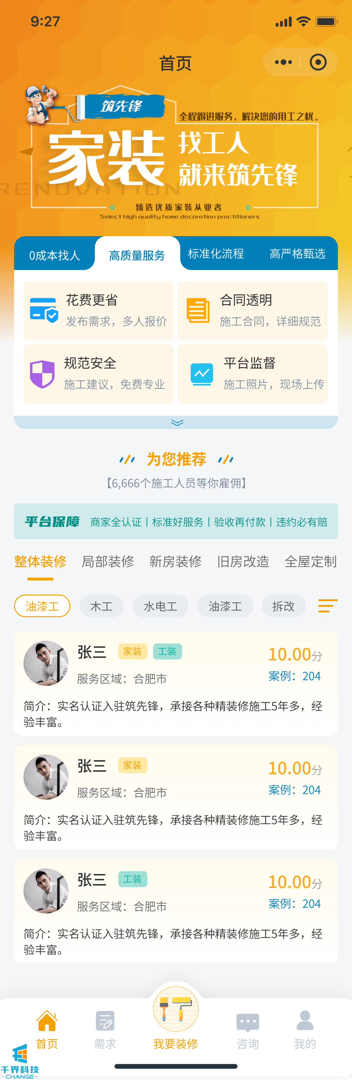 該項目是一個(gè)裝修小程序,用戶(hù)發(fā)布需求,師傅接單,師傅完工后用戶(hù)驗收評價(jià),用戶(hù)也可以直接咨詢(xún)師傅下單,有即時(shí)通訊公告