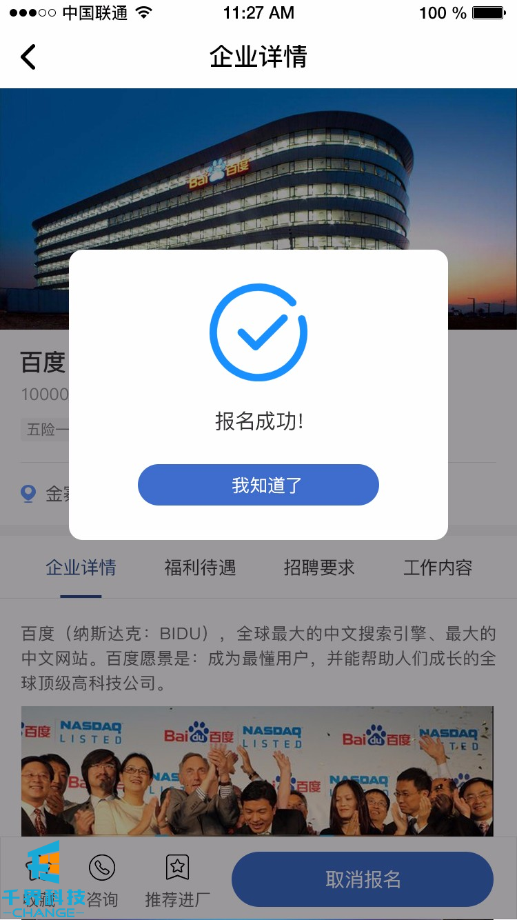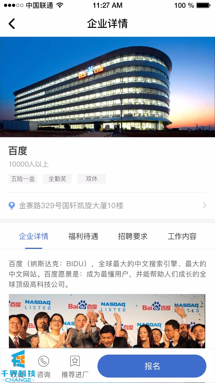 該項目是一個(gè)針對藍領(lǐng)招聘的app。里面包含崗位發(fā)布,在線(xiàn)招聘,會(huì )員繳費,推薦分銷(xiāo),在線(xiàn)報名,崗位收藏,傭金結算,在線(xiàn)提現等功能。