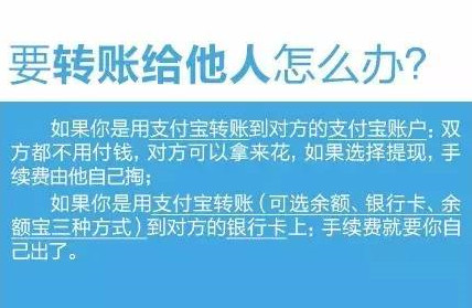 但要轉賬給他人該怎么辦呢?1、如果你用支付寶轉賬到別人的支付寶賬戶(hù)里,那雙方都不用花錢(qián),對方可以拿來(lái)花,但是要是提現的話(huà),手續費由他自己承擔。2、如果你是用支付寶轉賬(余額、銀行卡、余額寶皆可)到別人銀行卡上,那手續費就得你自己掏。