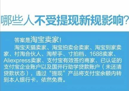 也許你還不知道,現在還有一部分人不受支付寶提現新規定影響,比如說(shuō)淘寶天貓的賣(mài)家、淘寶拍賣(mài)會(huì )的賣(mài)家、淘寶到家的賣(mài)家、村淘合伙人、淘幫手、寸拍檔、1688的賣(mài)家、Aliexpress的賣(mài)家、支付寶有效簽約的商家、已認證的支付寶企業(yè)賬戶(hù)、國開(kāi)行助學(xué)貸款賬戶(hù)(未還清貸款狀態(tài))。