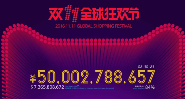 02:30:20,2016天貓雙11全球狂歡節交易額超500億元,無(wú)線(xiàn)交易額占比83.72%。