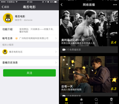 左為公眾號介紹頁(yè);右為公眾號主體開(kāi)發(fā)的小程序